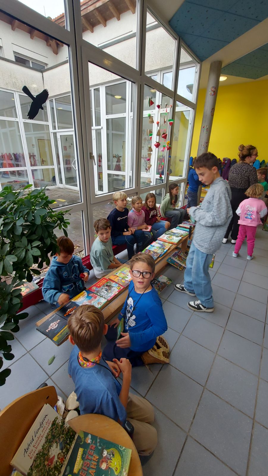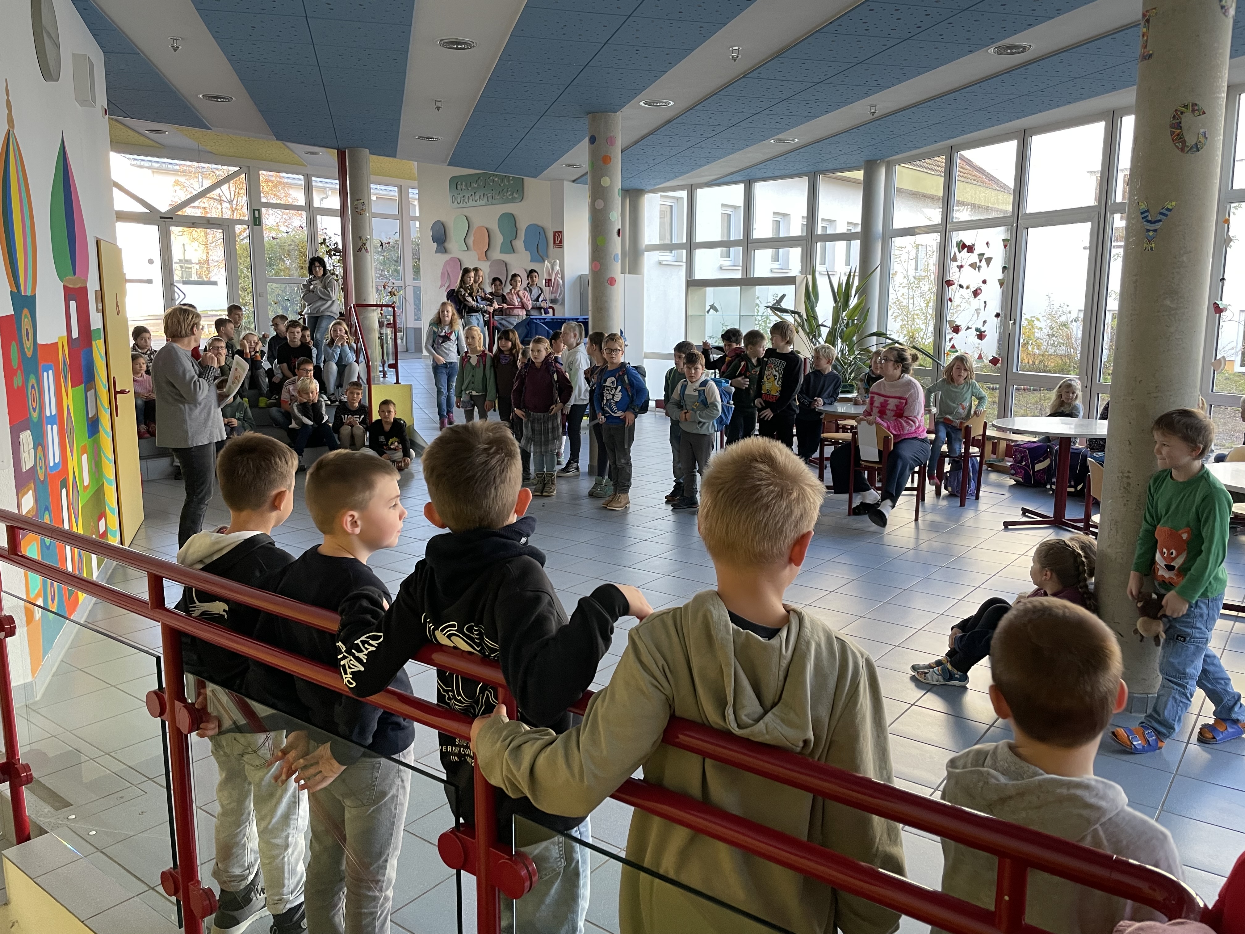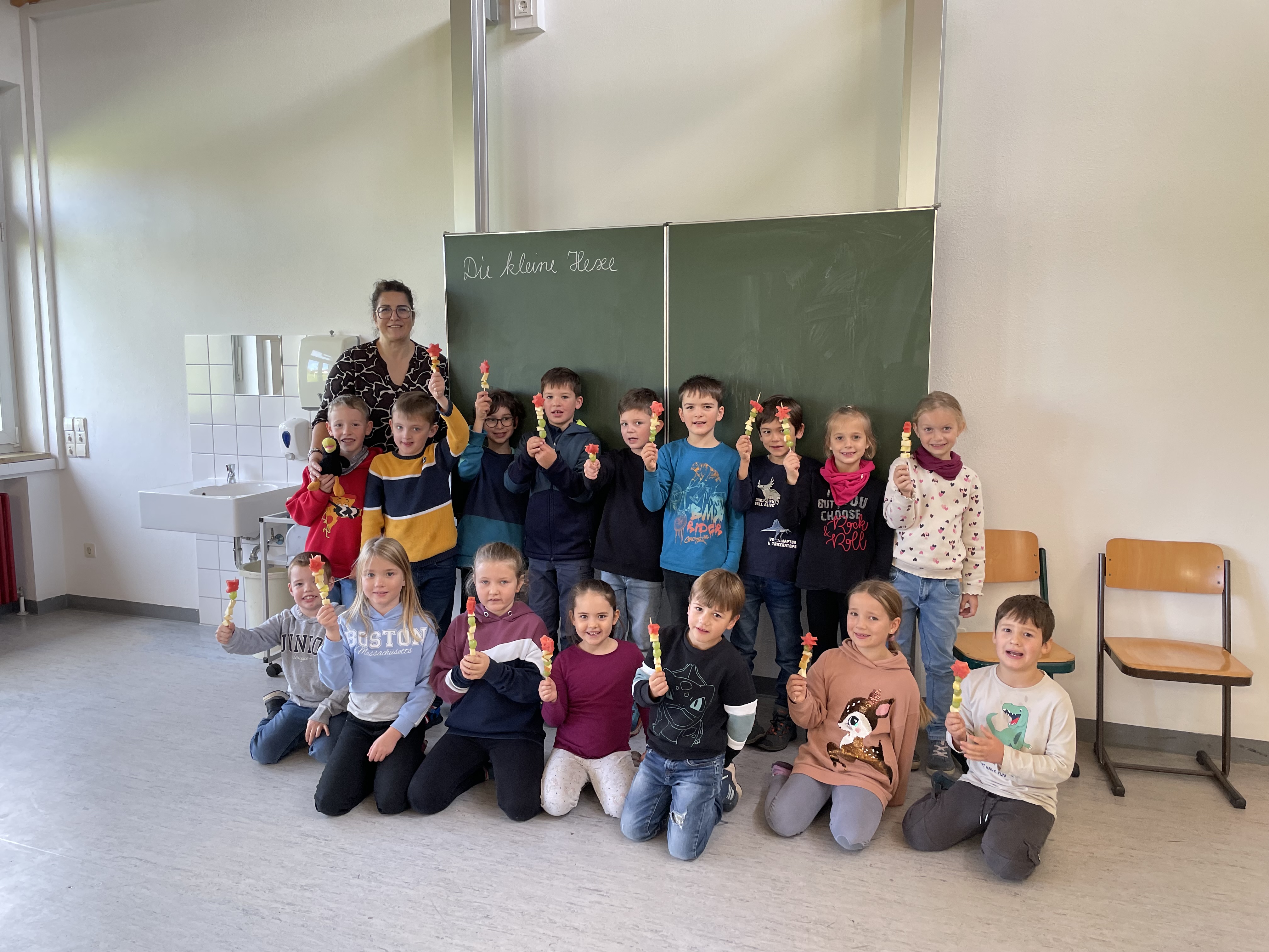Die Erst- und Zweitklässler tauchten in die fabelhafte Welt der kleinen Hexe und ihres Rabens Abraxas ein. Unterbrochen wurde das Vorlesen immer wieder durch Aktivitäten. So mussten die Kinder essbare Zauberstäbe aus Obst herstellen oder imaginäre Ware als Marktschreier verkaufen. Am Ende schafften es tatsächlich alle Kinder die Hexenprüfung zu bestehen, indem sie mit einem eigenen Zauberspruch ihre selbstgemachten Zauberblumen zum Blühen brachten.