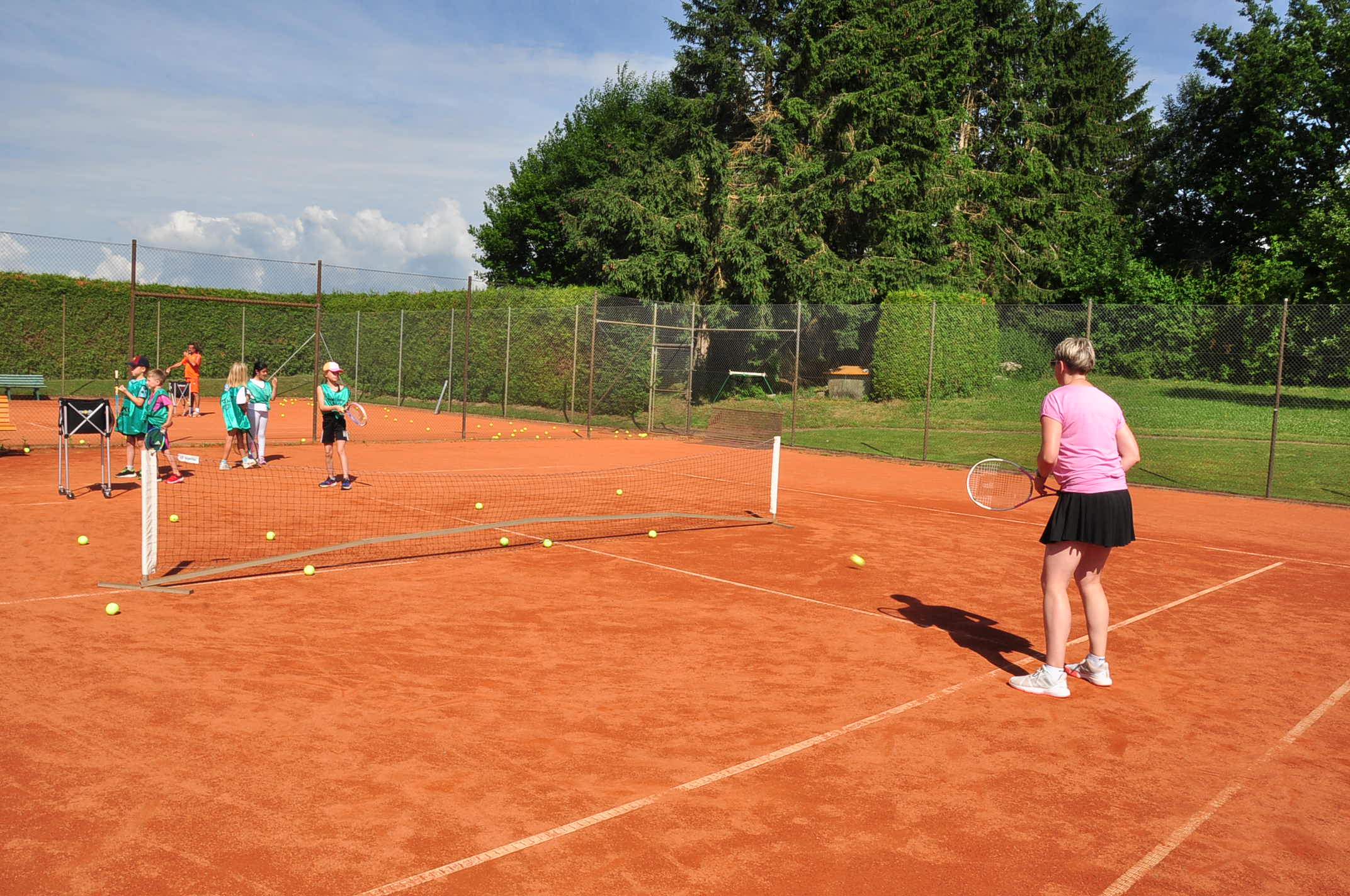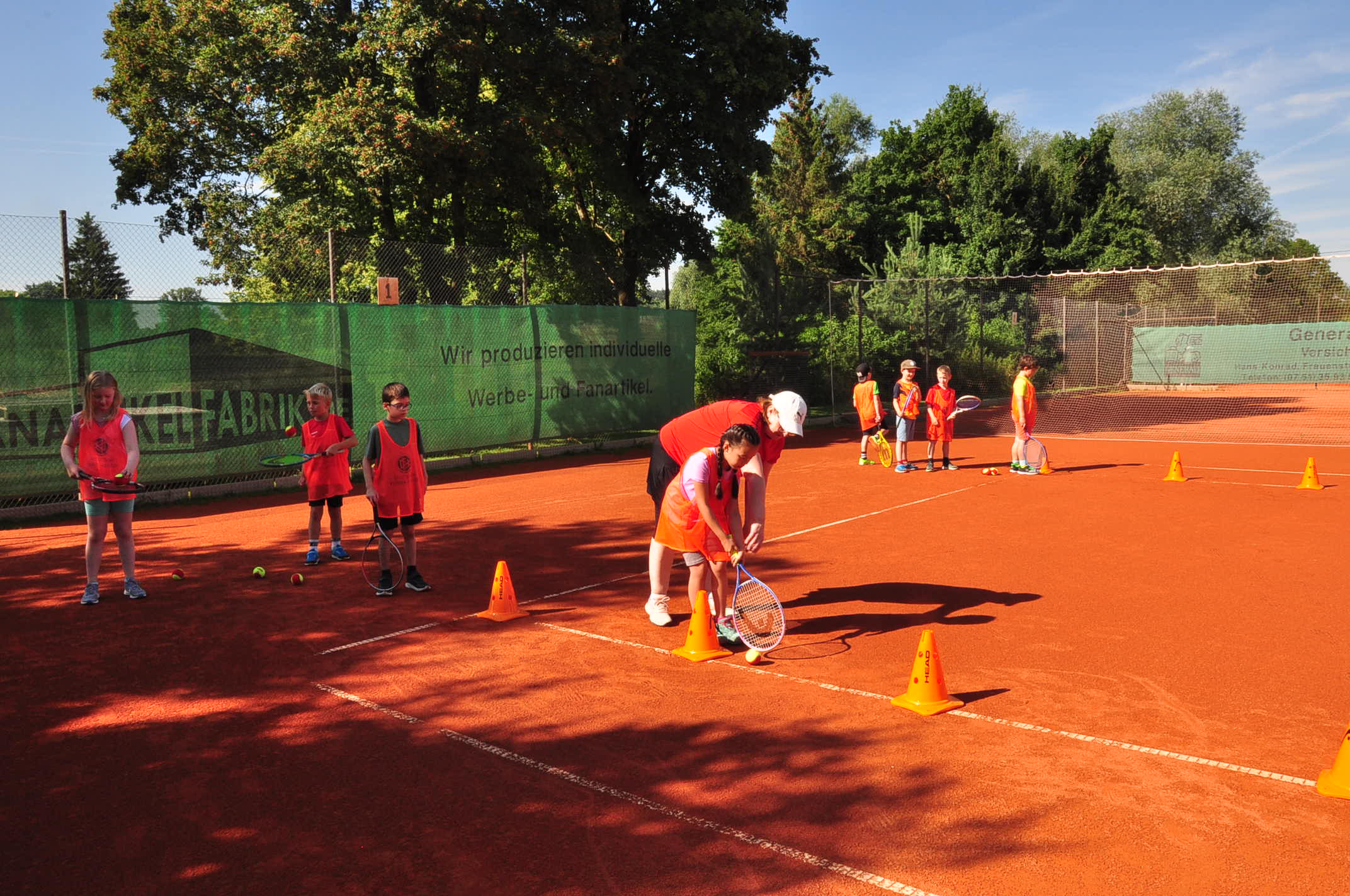 Auch ein Tennis-Schnuppertraining wurde auf dem benachbarten Tennisplatz angeboten und einige Kinder nutzen die Gelegenheit, auch diese Sportart kennenzulernen und erste Übungen mit dem Schläger und dem Tennisball zu versuchen.